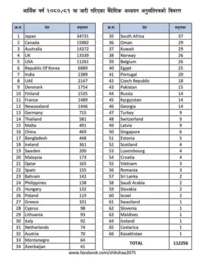 त्यसरी अध्ययनका लागि सबैभन्दा बढी जापान गएका छन् । जापानका लागि ३४ हजार ७३१ विद्यार्थीले एनओसी लिएका छन् । त्यस्तै दोस्रोमा क्यानडाका लागि रहेका छन् । क्यानडाका लागि १५ हजार ९८२ जनाले एनओसी लिएका छन् ।