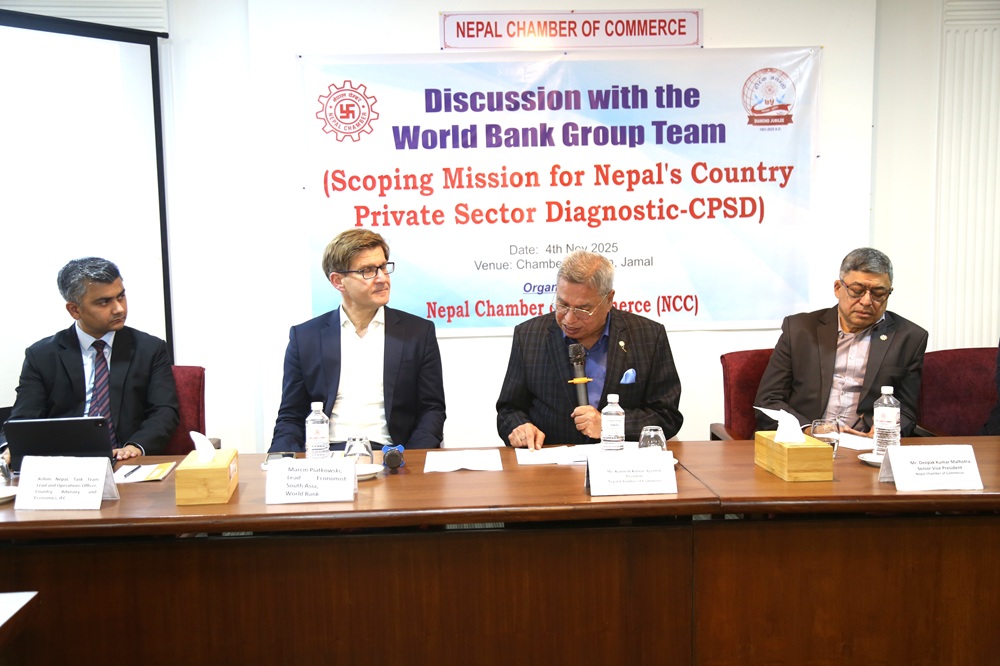 नेपाल चेम्बर अफ कमर्स र विश्व बैंक समूहबीच नेपालको निजी क्षेत्रको अवस्था, लगानीका अवसर र बर्तमान चुनौतीबारे उच्चस्तरीय छलफल भएको छ ।