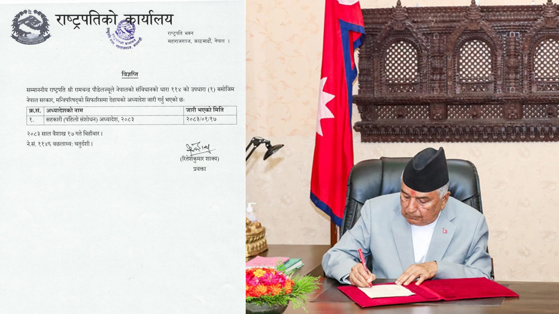 शीतल निवासबाट प्रवक्ता शाक्यले जारी गरेको विज्ञप्तिमा मन्त्रिपरिषद्को सिफारिसमा नेपालको संविधानको धारा ११४ को उपधारा ९१० बमोजिम सो अध्यादेश प्रमाणिकरण भएको हो ।