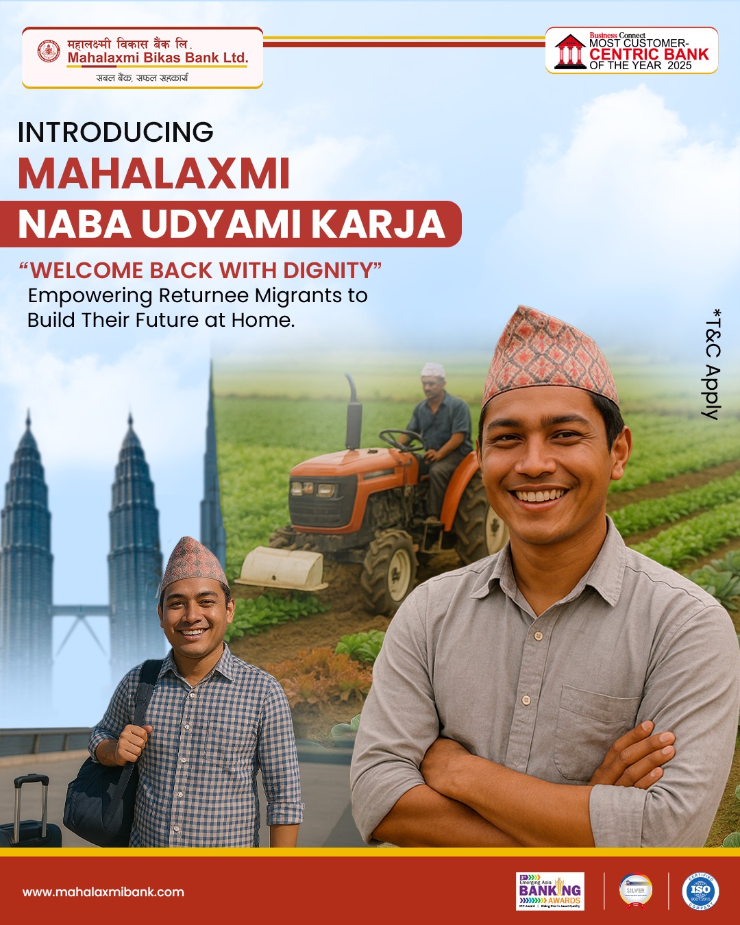 महालक्ष्मी विकास बैंकद्धारा वैदेशिक रोजगारबाट फर्किएका व्यक्तिहरुलाई सफल उद्यमी बनाउने उद्धेश्यका साथ आकर्षक ब्याजदरमा नव उद्यम कर्जा सञ्चालनमा ल्याएको छ ।