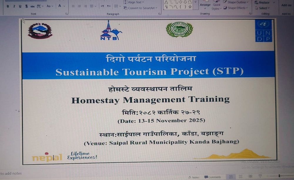 काठमाडौं । ग्रामीण पर्यटनको सम्भावना बढ्दै गएको बझाङको साईपाल क्षेत्रमा निजी तथा सामुदायिक होमस्टे सञ्चालनलाई व्यावसायिक, सुव्यवस्थित र दिगो बनाउने उद्देश्यले साईपाल गाउँपालिका–३, काँडामा तीनदिने ‘होमस्टे व्यवस्थापन तालिम’ सञ्चालन गरिएको छ । साईपालमा सञ्चालन गरिएको यस ‘होमस्टे व्यवस्थापन तालिम’ले गाउँमा दीगो पर्यटनको नयाँ ऊर्जा सञ्चार गरेको छ ।
